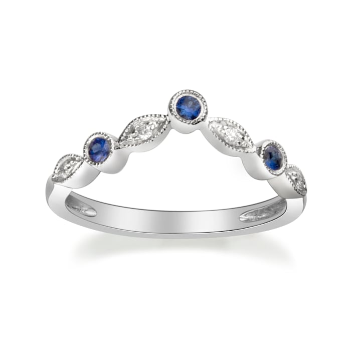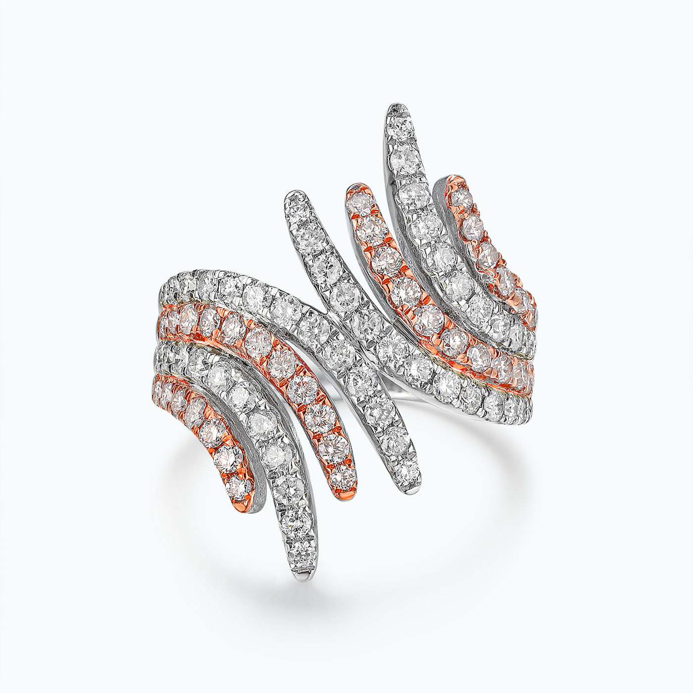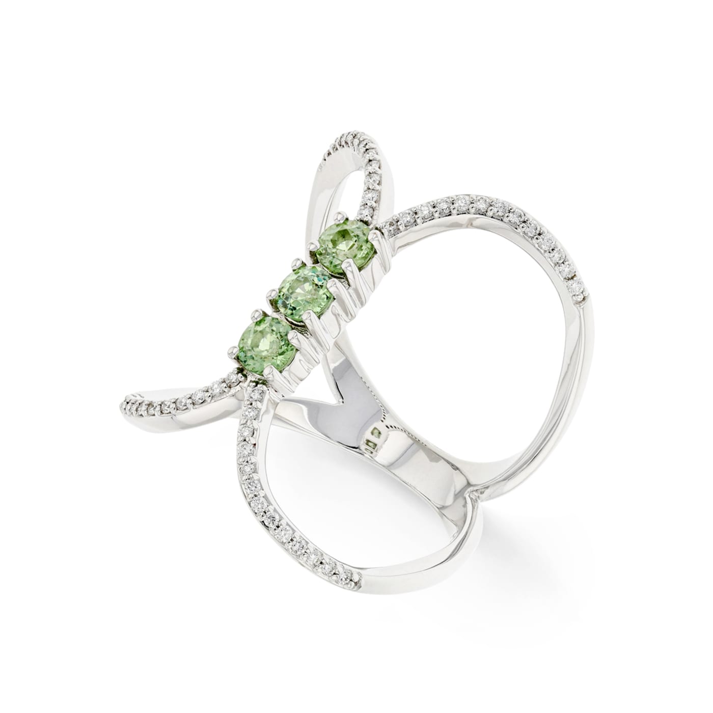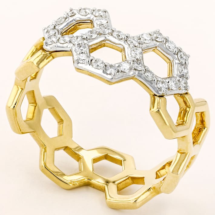In a bridge ring, the center motif is raised above its band, just as a highway bridge is raised above water. The band beneath can be plain metal or set with gemstones.