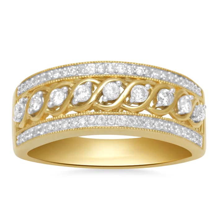 A band-style ring is a simple circle of metal without gemstones. This style can be detailed in metalwork that enhances its design. Ropes, animals, filigree and milgrain designs are often added to the plain band.